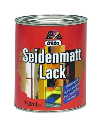 düfa Seidenmattlack ist ein lösemittelhaltiger, aromatenfreier Kunstharzlack mit ausgezeichneten Verarbeitungseigenschaften, blockfest, stoß-, kratz- und schlagfest, guter Verlauf, hohes Deckvermögen, sehr ergiebig, schnelltrocknend, sehr gute Glanzhaltung, geruchsarm
