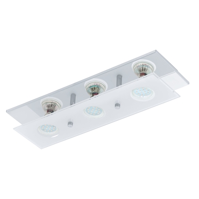 Deckenleuchte Arborio, Glas satiniert Die LED Deckenleuchte ARBORIO ist aus einem rechteckigen Edelstahl-Körper in Chromfarben und einer aufgesetzten, satinierten Glas-Platte gefertigt. Die drei LED GU10-Leuchtmittel spenden angenehmes warmweißes Licht und sind im Lieferumfang enthalten. Die Leuchte bietet eine zeitlose Beleuchtung für jeden Raum, ob in der Küche, im Wohnzimmer, Esszimmer oder Flur.