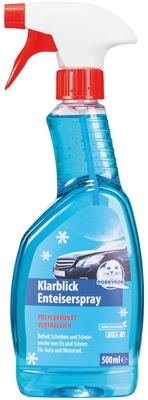 Enteiserspray Sprühflasche, 0, 5l Schafft klare Sicht und Sicherheit im Winter. Geprüfte Qualität, sorgt schnell für eisfreie Autoscheiben und schützt vor Neuvereisung. Leicht verständliche Gebrauchsanweisung, Dosierangaben sowie Sicherheitsratschläge auf einen Blick.