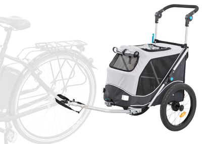 2 ...Fahrrad-Anhänger für Hunde Mit Schnell-Falt-Funktion sekundenschneller Auf- und Abbau Räder mit Schnellbefestigungssystem oberer und vorderer Netz-Einsatz mit Regenschutz abdeckbar mit Hecktür Kissen mit viscoelastischem Schaum mit integrierter Kurzleine mit diversen Taschen und Getränkehalter mit beidseitiger Feststellbremse reflektierende Elemente Signalwimpel mit reflektierendem Motiv Frontrad zum Buggy-Umbau separat erhältlich (Artikel 12795) inklusive Anhängerkupplung durch Schnell-Click-Funktion einfacher Umbau zum Buggy möglich mit höhenverstellbarem Griff zusammenklappbar herausnehmbare Bodenplatte mit Anti-Rutsch-Bezug Stahl, Polyester-Bezug Farbe: grau/schwarz tierschutzkonform nach § 18 (AT) Bitte prüfen Sie im Vorfeld die Kompatibilität von Fahrrad und Anhängerkupplung. Die Maße der TRIXIE-Anhängerkupplung finden Sie unter dem Artikel 12819.