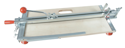 Grundplatte aus verleimtem Hartholz, mit Griffloch, Brechvorrichtung, mm-Zahlenskala, Anschlag für Diagonalschnitte und Winkelanschlag, ausklappbare Auflageschiene für Anschlagwinkel, Gummibeläge an der Unterseite der Führungsschienen, Federarretierung zur Befestigung der Führungsschiene, TITAN- beschichtetes HM- Schneidrad Ø 20 mm, für längere Lebensdauer, für Platten von 3