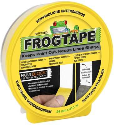 Frogtape Delicate FROGTAPE® ist das einzige Malerband mit der patentierten Paint Block®-Technologie. Paint Block® ist ein Pulver, das mit Dispersionsfarbe reagiert und sofort fest wird. Dadurch bildet es eine Mikrobarriere, die die Ränder des Bandes abdichtet und so ein Unterlaufen der Farbe verhindert. Das Ergebnis: Scharfe Farbkanten, kein Unterlaufen von Farbe. FROGTAPE® liefert das perfekte Ergebnis in einem Arbeitsschritt, ohne lästigen Voranstrich. FROGTAPE® Delicate ist ideal geeignet für den Einsatz auf Tapeten oder sensiblen Untergründe, da es sich von den meisten Oberflächen bis zu 21 Tage lang (sieben Tage bei direkter Sonneneinstrahlung) sauber entfernen lässt. FROGTAPE® ist das professionelle Malerband für scharfe Farbkanten.- Breite: 24 mm,