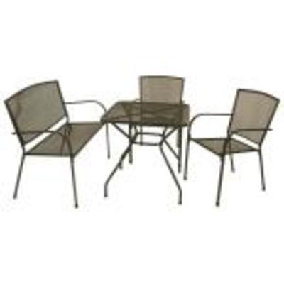 Garnitur 4-teilig, Streckmetall Die Sitzgarnitur ist 4-teilig und besteht aus zwei stabilen Stapelsesseln, einer Bankfür 2 Personen und einem quadratischen Tisch.