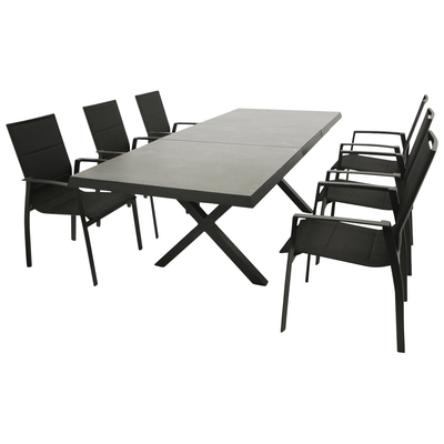 Garnitur 7-teilig, Ausziehtisch, Aluminium/ Textillene/ Glas Garnitur 7-teilig (6x Klappsessel mit Aluminiumgestell grau, Bespannung Textilene schwarz mit Polsterung, 1x Ausziehtisch, Aluminium dunkelgrau + Glas).- Farbe: grau/schwarz,