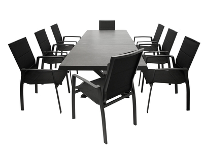 Garnitur 9-teilig, Ausziehtisch, Aluminium/ Textilene/ Glas Garnitur 9-teilig (8x Klappsessel mit Aluminiumgestell grau, Bespannung Textilene schwarz mit Polsterung, 1x Ausziehtisch, Aluminium dunkelgrau + Glas).- Farbe: grau/schwarz,