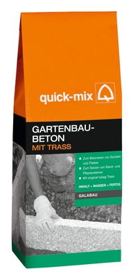 - ...Gartenbau-Betonquick-mix Gartenbau Beton mit Trass ist speziell für Betonierarbeiten im Garten und rund ums Haus geeignet. Zum Setzen von Randsteinen, Gehwegplatten, Pflastersteinen. Zur Erstellung von Beeteinfassungen, Betonbauteilen, Zaunpfählen. Ebenso können Fundamente für z.B. Carports, Garagen, Terrassen etc. erstellt werden. Auch für DIN-relevante Betonbauteile geeignet.- Inhalt: 10kg
