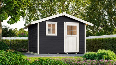 Gartenhaus 123 Gartenhaus in stabiler Blockbohlenbauweise, Farbe außen: anthrazit, 28 mm Wandstärke, mit 19 mm Massivholzdach und Massivholzboden, Dachüberstände: Seiten je ca. 40 cm, hinten 5 cm, vorne 20 cm, Grundfläche: 8, 85 m², Bemaßung: Firsthöhe 255 cm, Seitenwand 196 cm (ab Oberkante Fundament) Tür: Rahmen-Einzeltür mit Sprossen, Durchgangsmaß 81x 173 cm Fenster: Dreh-/ Kippfenster mit Kreuzsprossen (Abb. ohne Zubehör und Dekoration, Gestaltungsbeispiel)
