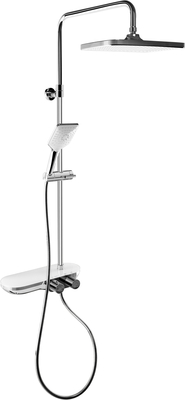 Material: Edelstahl, Ø22 mm, Variable Höhe – Individuell einstellbare Länge: 850-1100 mm, Ausladung: 340 mm, Drucktasten-Schieber, Verchromt, Kopfbrause, Mit Kugelgelenk, Kopfgröße: 300x 200 mm, Sprayplatte: weiß, 1 Strahlart, Normal-Strahl, Antikalk Funktion, Verchromt/weiß, Handbrause, Kopfgröße: 98x 98 mm, Sprayplatte: weiß, 3 Strahlarten: Normal-, Massage, Normal-/ Massage-Strahl, Antikalk Funktion, Verchromt/weiß, Brauseschlauch,