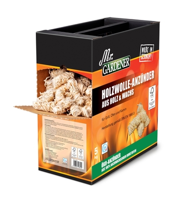 Holzwolleanzünder-ko-Anzündwolle aus Naturholz und pflanzlichem Wachs zum sicheren, geruchsarmen und sauberen Anzünden von Grill, Ofen und Kamin. FSC®-zertifiziertes Produkt aus 100 % nachwachsenden Rohstoffen. 5-kg-Koffer mit Schüttvorrichtung und eingelassenem Tragegriff. Entspricht DIN EN 1860-3.- Gewicht: 5 kg,