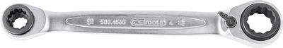 Quadro-Ratschenschlüssel 10x 13/17x 19mm KSDoppel-Ringratschen-Schlüssel, umschaltbar• Sehr fein satiniert• Chrom-Vanadium-Stahl• Gerade Form• Umschaltung mittels Umschalthebel• Feinverzahnt, 72 Zähne•4 Schlüsselgrößen in einem Schlüssel- Schlüsselweite: 10 x 19; 13 x 17 mm