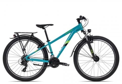 Schutzbleche, Seitenständer und Gepäckträger sind ebenfalls ab Werk montiert., Optisch an Mountainbikes angelehnt und mit im Rahmen verlegten Zügen, zeigt sich das Axess Stipe DX 26 Jugendrad trotz Straßenausstattung schön sportiv., Auf der Basis einen Mountainbikes bekommst du mit dem Axess Stipe DX 26 ein Straßenverkehr-taugliches All-Terrain-Bike für Kids ab etwa 12 Jahren., Somit bietet sich das Stipe DX 26 ideal als Schulrad an., Dank fest installierter Lichtanlage und Nabendynamo kann jederzeit ohne Mühe mit eingeschaltetem Licht gefahren werden., Das erhöht die Sichtbarkeit und du musst nicht mehr an die Lichtbatterien denken., Mit dem 2x 7 Shimano Antrieb können junge Fahrradfans zwischen insgesamt 14 Gängen auswählen und dank Federgabel und grobstolliger Bereifung, kann der Untergrund ruhig etwas gröber werden.