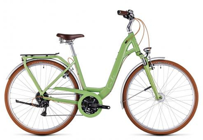 Ein Plus an Nostalgie und Sicherheit, liefert der moderne Trelock LED-Scheinwerfer in Retro-Optik., Die am Ella Ride verwendete Shimano Kettenschaltung bietet dir mit ihren insgesamt 24 wählbaren Schaltstufen ein hervorragendes Übersetzungsspektrum für Fahrten durch die City und auf Wochenend-Ausflügen., Die aufrechte Sitzposition ergibt, zusammen mit dem leicht gekrümmten Lenker, eine komfortable Fahrweise und lässt dich im Straßenverkehr die Übersicht behalten., Der Kettenkasten, der im Rahmen integrierte Gepäckträger und die Federgabel sind ebenfalls in der Rahmenfarbe lackiert und schaffen ein harmonisches Gesamtbild., Das Cube Ella Ride Citybike bietet dir komfortablen Fahrgenuss in der Stadt und das schöne Farbkonzept macht es zu einem wunderbaren Farbtupfer im