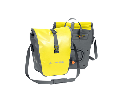 Vaude Aqua Fronttaschen: Auf in die große, weite Welt! Die wasserdichten Vorderradtaschen AQUA FRONT von Vaude werden aus robustem, PVC-freiem Planenmaterial klimaneutral am deutschen VAUDE-Standort in der Nähe des Bodensees hergestellt. Sie lassen sich durch den Wickelverschluss auf individuelle Größen bringen und absolut dicht verschließen. Für Übersichtlichkeit sorgt eine extra Innentasche. Die Taschen werden mit dem QMR 2.0-System und stabiler Rückenplatte rechts und links am Gepäckträger befestigt, sind über einfach bedienbare Handrädchen justierbar und lassen sich schnell und einfach abnehmen. Mit einem Fahrradschloss können sie direkt am QMR-Haken verriegelt werden. Reflexelemente sorgen für eine gute Sichtbarkeit im Straßenverkehr. Lieferumfangzwei Taschen (Paar) Produktmerkmale:geräumiges Hauptfachwasserdichter Wickelverschluss QMR abschließbarleicht einstellbares QMR 2.0 Befestigungssystem Reflexlogo Schultergurt und