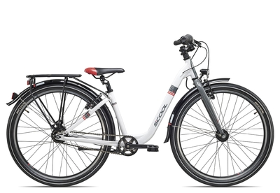 SCool chi X SL 26-7: Das leichte SCool chi X SL 26 7 Jugendrad ist rundum verkehrssicher ausgestattet und begeistert mit seinem sportiven Farb-Design. Die helle LED-Lichtanlage wird von einem am Vorderrad montierten Panasonic Nabendynamo nahezu unbemerkt mit Energie versorgt. Fast ohne Tretwiderstand kann somit auch tagsüber mit eingeschaltetem Licht gefahren werden: Für eine erhöhte Sichtbarkeit und mehr Sicherheit im Straßenverkehr. Die 7 Gänge der wartungsarmen Nexus Nabenschaltung aus dem Hause Shimano werden einfach und unkompliziert per Drehgriff geschaltet. So können sich junge Fahrer bereits mit einfachen Schaltvorgängen vertraut machen. Wir empfehlen das gut 13kg leichte chi X SL 26 Zoll Kinderfahrrad ab ca. 12 Jahren bei einer Körpergröße ab 150 cm.