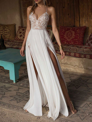 A Linie Brautkleid elfenbeinweiß Chiffon V-Ausschnitt ärmellos A Linie Hochzeitskleid & Hochzeit > Brautkleider > A-Linie Brautkleider