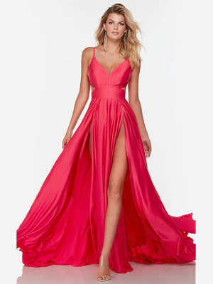 Ballkleider Rot Ball kleider Satingewebe Hochzeit A-Linie- Mit Schleppe V-Ausschnitt ärmellos Anlass Kleider und Schlitz an der Front & Hochzeit > Anlass Kleider > Ballkleider