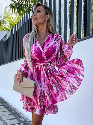 Bedrucktes kurzes Kleid mit Surplice-Ausschnitt Gürtel und Laternenärmeln Minikleider & Damenmode > Kleider > Blumenkleid