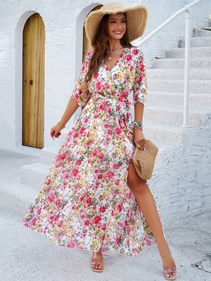 Bedrucktes Wickelkleid mit V-Ausschnitt Gürtel halblangen Ärmeln elegante lässige Maxikleider & Damenmode > Kleider > Bohemian Kleider