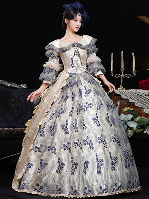Blaues Retro-Kostüm mit Rüschen aus Polyester-Jacquard Marie Antoinette-Kostümkleid für Damen im Retro-Stil aus dem 18. Jahrhundert & Kostüme > Kostüme > Vintage Kostüme > Damen Mittelalter Kleidung ...