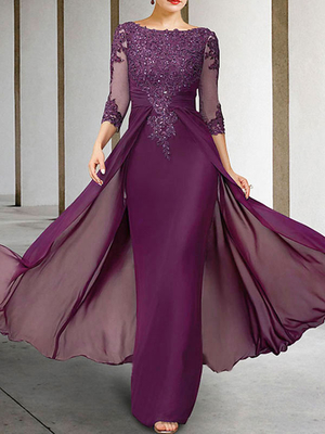 Brautmutterkleider Etui- Abendkleider für Hochzeit Chiffon Champagner 3/4 Ärmel mit Bateau-Kragen bodenlang und Reißverschluss & Hochzeit > Abendkleider für Hochzeit > Brautmutterkleider