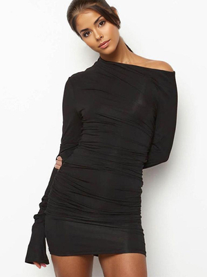 Figurbetontes Kleid Weiß Plissiert Asymmetrisch Sexy Lange Ärmel