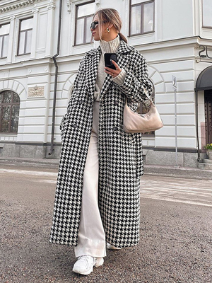 Hahnentritt-Mantel mit Revers und Knöpfen volle Länge Winteroberbekleidung & Damenmode > Mäntel > Trenchcoats