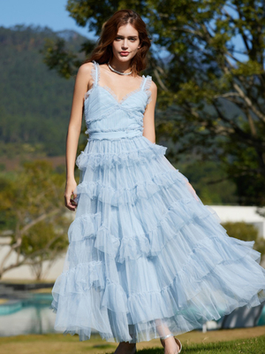 Hellhimmelblaue Kleider V-Ausschnitt Rüschen ärmellos mehrlagiges Party-Abschlussball-Maxikleid & Damenmode > Kleider > Party Kleider