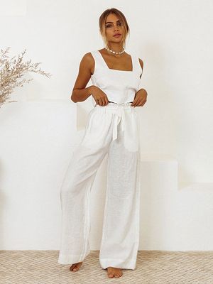 Hosenset weiß lässig täglich lässig Schnürung zweiteilige Sets aus Baumwollleinen & Damenmode > Zweiteiler > Hosensatz