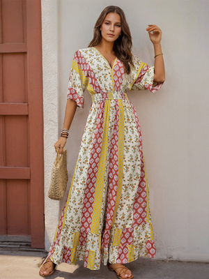 Jumpsuits mit Blumenmuster V-Ausschnitt kurzen Ärmeln weitem Bein Sommer-Outfit für Damen 2025 & Damenmode > Overall für Frauen