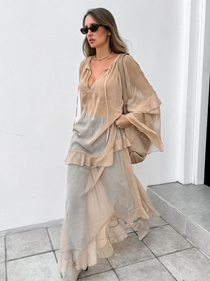 Khakifarbenes Transparentes Langes Lagenkleid Mit V-Ausschnitt Und