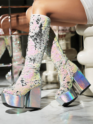 Kniehohe Stiefel mit Pailletten für Damen Plateaustiefel mit klobigem Absatz Partystiefel & Schuhe > Damen Schuhe > Stiefel > Kneestiefel