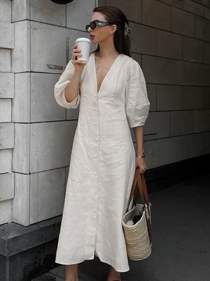 Langes Kleid mit halben Ärmeln und V-Ausschnitt für Damen 2025 & Damenmode > Kleider > Sommerkleider