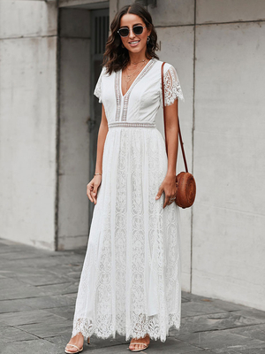 Maxikleid mit V-Ausschnitt ausgehöhlt kurze Ärmel lässig lange Sommerkleider & Damenmode > Kleider > Spitzenkleider