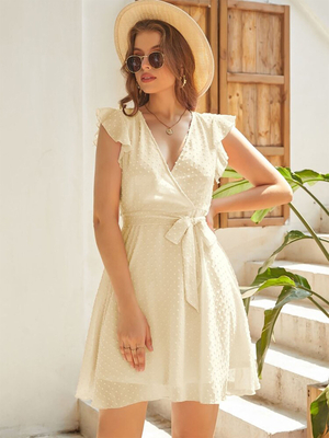 Minikleid mit Rüschenärmeln Gürtel und V-Ausschnitt für den Sommer 2025 & Damenmode > Kleider > Sommerkleider