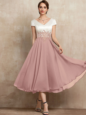 Mutterkleid V-Ausschnitt Kurze Ärmel A-Linie Spitze Wadenlang Gastkleider für Hochzeit & Hochzeit > Abendkleider für Hochzeit > Brautmutterkleider