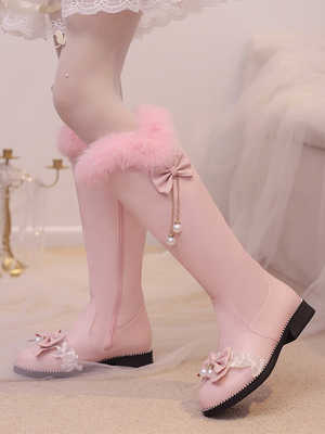 Süße Lolita-Stiefel mit rosa Schleifen und runder Spitze aus PU-Leder & Lolita Kleidung > Lolita Schuhe
