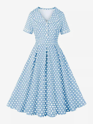 Vintage Kleid 1950er Jahre Audrey Hepburn Stil Hellhimmelblau Polka Dot Knöpfe Kurze Ärmel Umlegekragen Medium Swing Kleid & Damenmode > Kleider > Vintage Kleider