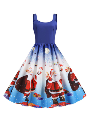 Vintage Kleider Blau mit Printmuster 50er jahre mode Rockabilly kleid und Schleife Kleider ärmellos und Rundkragen Polyester im altmodischen Stil & Damenmode > Kleider > Vintage Kleider ...