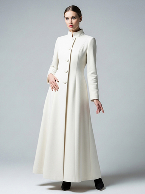 Weißer Wollmantel in voller Länge mit Stehkragen und A-Linien-Silhouette für Damen 2025 & Damenmode > Mäntel > Damenmäntel