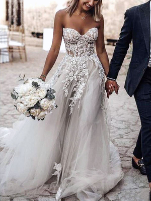 Weißes Spitzen-Hochzeitskleid mit Schleppe ärmellos rückenfrei Tüll trägerlos A-Linie Brautkleider kostenlose Anpassung & Hochzeit > Brautkleider > Boho Brautkleider
