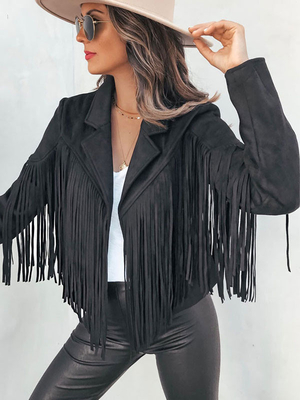 Wildlederjacke Schwarz Umlegekragen Fransen Revers Hohe Taille Volltonfarbe Oversized Relaxed Fit Frühling Herbst Street Oberbekleidung für Damen & Damenmode > Mäntel > Damenjacken