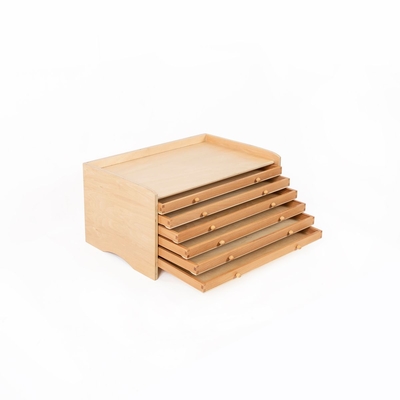 Diese schlichte Holzkommode bietet bei geringem Umfang ein Höchstmaß an Stauraum für diverse Materialien. Ob für verschiedene Einsatzfiguren, die Metallenen Quadrate oder den Metallenen Bruchrechensatz – die Kommode bietet die ideale Aufbewahrung, wo alles am richtigen Platz liegt und nichts verstauben kann.