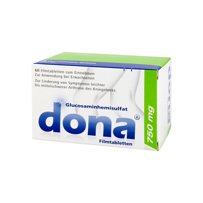Wichtige Hinweise (Pflichtangaben): dona 750 mg Filmtabletten. Wirkstoff: Glucosaminhemisulfat. Anwendungsgebiete: Zur Linderung von Symptomen leichter bis mittelschwerer Arthrose des Kniegelen... ...