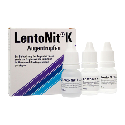 Produkteigenschaften: Lento Nit K Augentropfen Inhaltsstoffe: Kaliumiodid, Calciumchlorid 2 H20, Natriumthiosulfat 5 H20, Sorbitol, Wasser für Injektionszwecke Chlorhexidindigluconat (Konservier... ...