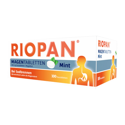 Wichtige Hinweise (Pflichtangaben): Riopan Magen Tabletten Mint, 800 mg Kautabletten. Wirkstoff: Magaldrat. Anwendungsgebiete: bei Sodbrennen und säurebedingten Magenbeschwerden und zur symptom... ...
