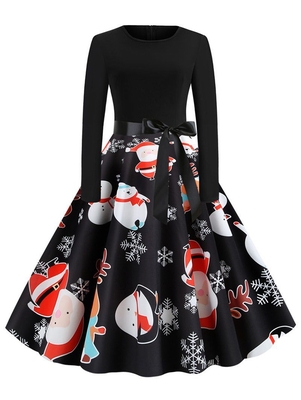 Santa Claus Reindeer Belted Christmas Long Sleeves Dress