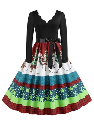 Scalloped Belted Plaid Snowman Christmas Tree Plus Size Dress