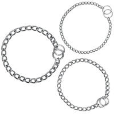 Halsketten für Hunde sind sowohl rein funktionale Accessoires, als auch Schmuck und Zierde genau wie die Ketten die wir Zweibeiner tragen. Wir bieten Ihnen ein komplettes Sortiment, von der einfachen, verchromten Stahlkette, bis zur 18 Karat-vergoldeten Feinkette. Bei den schmalen vergoldeten Ketten steht der Schmuckcharakter im Vordergrund. Sie sollten zu Haltezwecken nur für Hunde verwendet werden die immer sehr brav bei Fuß laufen. Je weniger und größere Glieder die Kette hat, desto Fellschonender ist sie, je breiter sie ist, desto komfortabler ist sie für den Hund. Eine Hunde-Halskette wird angelegt, indem man die komplette Länge der Kette durch eines der Ringe am Ende zieht, und die so entstandene Schlinge dann um den Hundehals legt. Eine Leine kann man dann am Anderen der beiden Ringe einhaken. Diese gängigste Methode bewirkt eine Würgefunktion wenn Zug ausgeübt wird. Alternativ kann die Leine auch an beiden Ringen befestigt werden. So ergibt sich keine Würgefunktion jedoch muss dann die Länge perfekt passen. Unsere Doppel- und Dreifachhalsketten haben eine „ Teilwürge“-Funktion, das bedeutet die Kette zieht sich nur bis zum Stop zu, der Hund kann nicht mehr aus der Kette hinausschlüpfen, und wird dennoch nicht gewürgt.