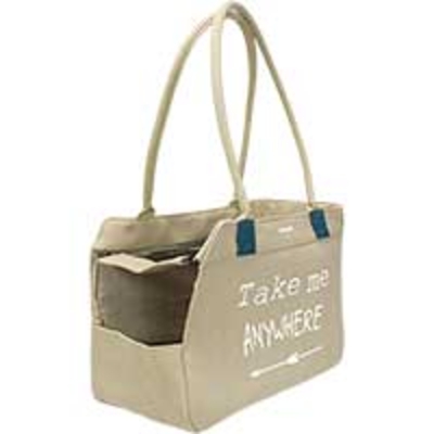 Modern lässige Schultertasche aus Canvas-Baumwolle mit ausreichend langen, seilähnlichen Riemen. Mit Ã-ffnung vorne, Netz oben, einer Tasche zum Einstecken des Netz-Endes (bei geöffnetem Netz), Karabiner mit Riemen zum Sichern des Hundes gegen Herausspringen und herausnehmbarer, flauschiger Bodenplatte. Für kleine Hunde und Welpen bis 5 kg. Farbe: Beige Größe ca. 40 x 20 x 28 cm