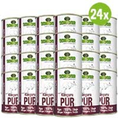 - auch für empfindliche bis sehr empfindliche Hunde getreidefrei glutenfrei geeignet zum BARFen* Ausgewählte Stücke zu 100% vom Känguru in bester Qualität.  Nur aus frischem Fleisch und wertvollen Innereien, wie Leber, Lunge, Magen etc. Echte, reine Qualitätsware! Frei von billigen Füllstoffen wie Soja etc., frei von Haltbarkeits-, Farb-, Konservierungs- und sonstigen Stoffen. Einfach nur Fleisch. Das Besondere an unserem PUR ist die selektive Komposition der Fleischsorten in einer Dose. Die Fleischsorten einer Tierart, wie Muskelfleisch, Herz, mineralreiche Leber werden so zusammengestellt, dass das Ergebnis ein aus ernährungsphysiologischen Aspekten rundum versorgendes, hochwertiges Alleinfutter ist. Also ein Dosenfutter, das obwohl nur von einer Tierart, doch alles enthält, was der Hundekörper für eine dauerhafte, gesunde Ernährung und optimale Fitness benötigt! PUR ist geeignet zum BARFen*, als Ausschlussdiät bei Futtermittelunverträglichkeiten oder einfach zum gezielten Füttern empfindlicher Hunde (-rassen). Auch zum Mixen z.B. mit unserem glutenfreien Sensi-Mix, unseren Gemüse PUR Dosen oder einer unserer vielen anderen Gemüse- oder Cerealienkomponenten geeignet. *biologisch artgerechtes rohes Futter